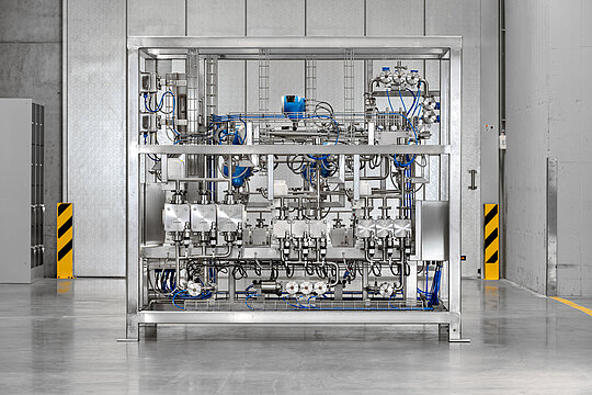 The preparation of buffer solutions in the chromatographic environment requires precise adherence to flow rates of the individual pump lines. The flow rates are determined with highly accurate mass-flow meters and set precisely to the specified target values via the speed control of the metering pumps. To control the process conditions, the pH value and conductivity are also monitored online.